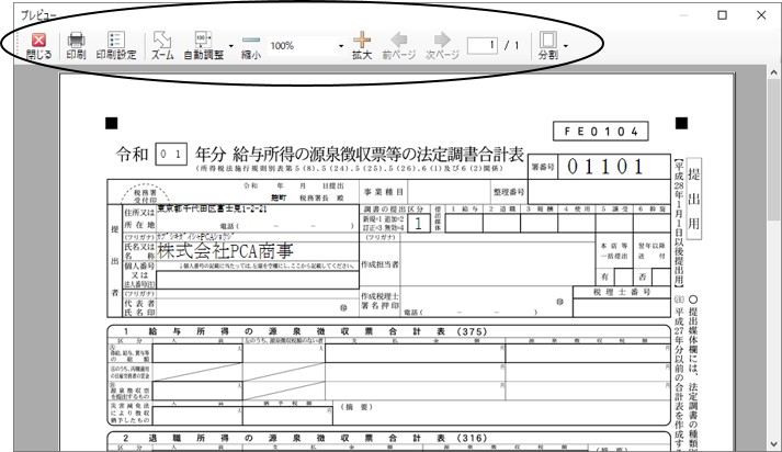 画面上部のボタンをクリックすることで印刷を実行したり、表示を切り替えたりすることができます。