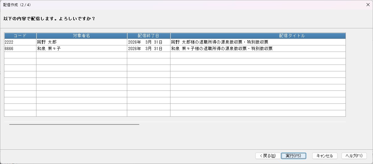 設定項目を確認し、配信作成を実行する場合は、[実行]ボタンをクリックします。