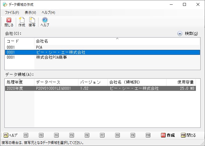 「データ領域の作成」である会社のデータ領域を“複写”してデータ領域を新規作成した場合