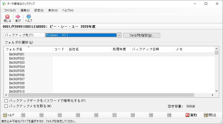 メニューの「ファイル」-「データ領域のバックアップ」を選択すると、以下のような画面が表示されます。