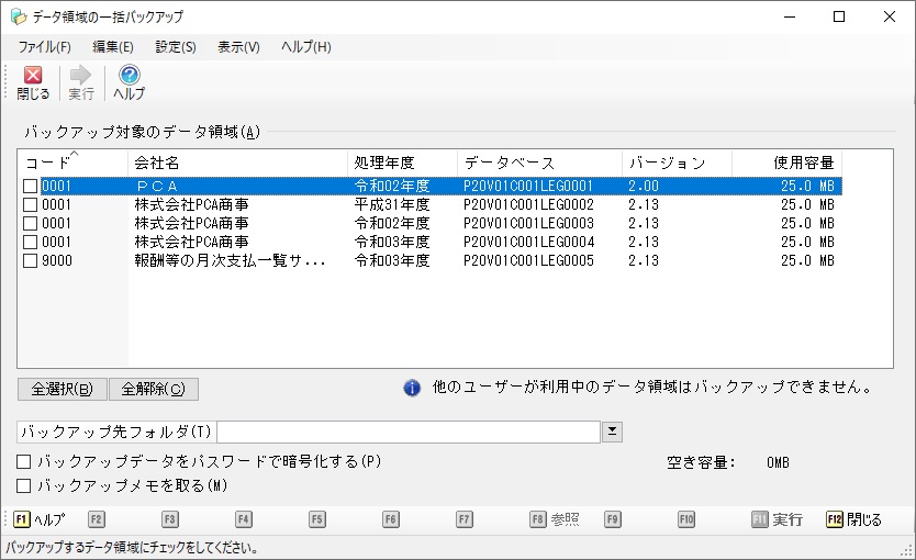 メニューの「ファイル」-「データ領域の一括バックアップ」を選択すると、以下のような画面が表示されます。