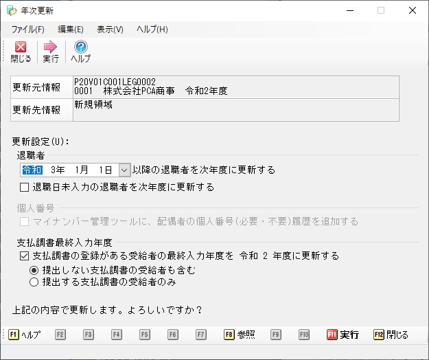 メニューの「ファイル」-「年次更新」を選択すると、以下のような画面が表示されます。
