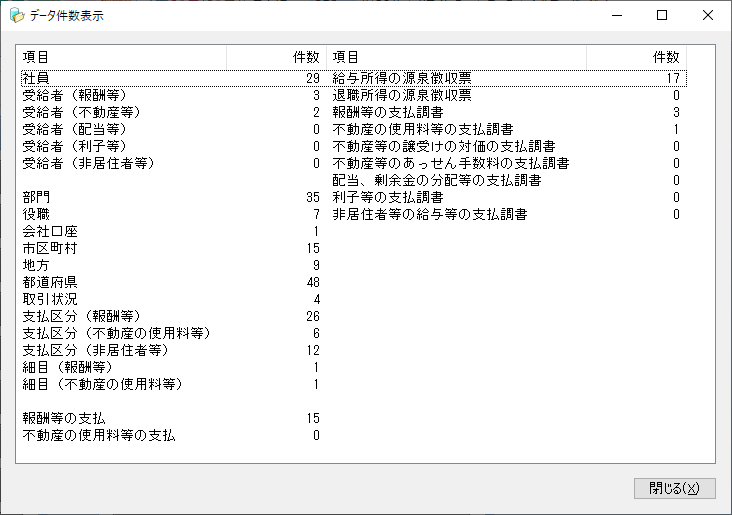 メニューの「ファイル」-「データ件数表示」を選択すると、以下のような画面が表示されます。
