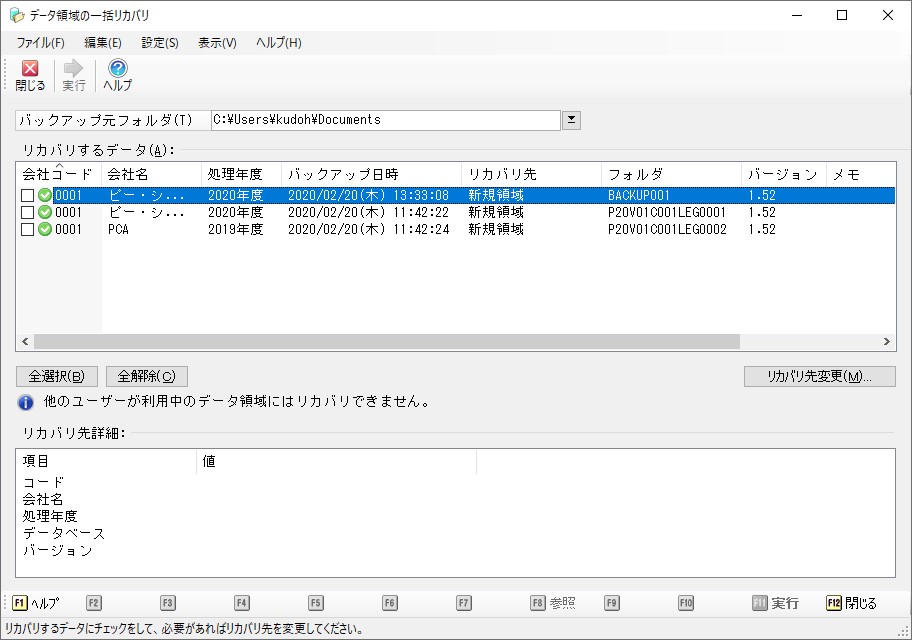メニューの「ファイル」-「データ領域の一括リカバリ」を選択すると、以下のような画面が表示されます。
