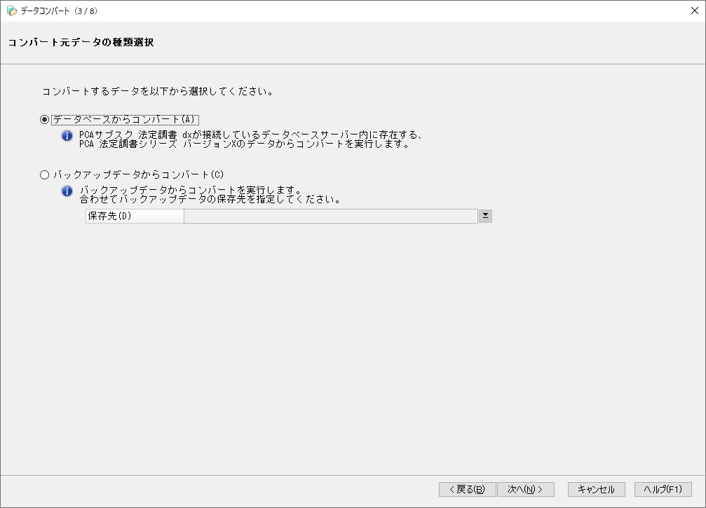 データベースからコンバート:ご利用になっていた『PCA 法定調書 シリーズ バージョンX』と『PCA 法定調書シリーズ バージョンDX』を同じパソコン、同じインスタンス名で運用する場合やデータベースサーバーが同じ場合などに選択します。
