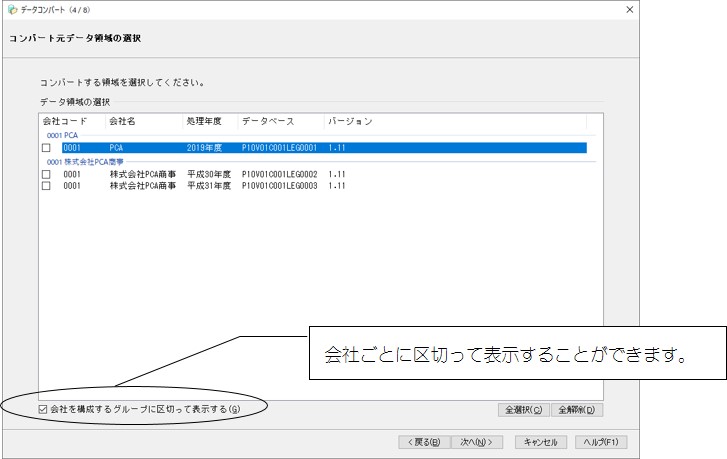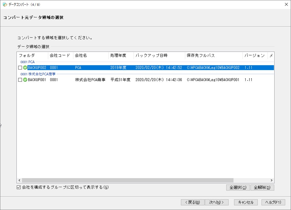 (3) コンバート元データ領域の選択画面が表示されますので、コンバートを実行するデータ領域にチェックマークを付けて、[次へ]ボタンをクリックします。