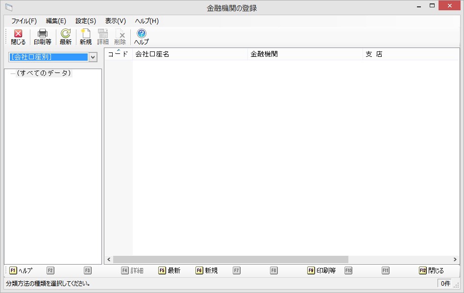 メニューの「前準備」-「金融機関の登録」を選択すると、以下のような画面が表示されます。