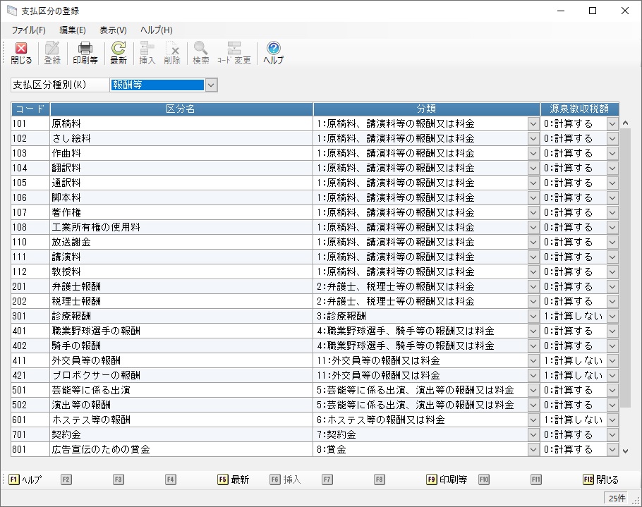 「支払調書1」-「報酬等の支払調書」「不動産の使用料等の支払調書」、「支払調書2」-「非居住者等の給与等の支払調書」で使用する支払区分を登録します。