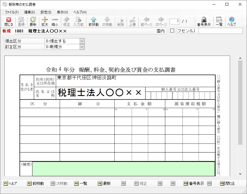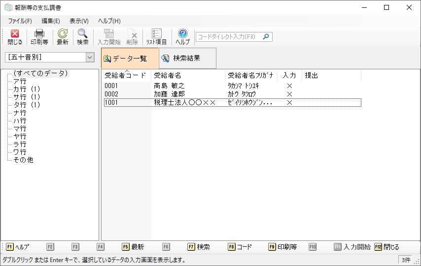 メニューの「支払調書1」-「報酬等の支払調書」を選択すると、以下のような画面が表示されます。