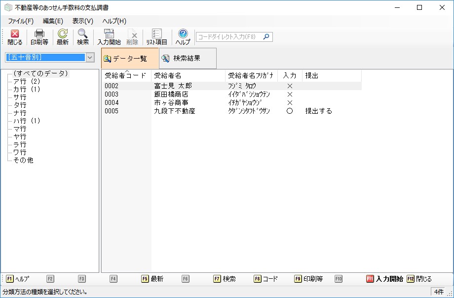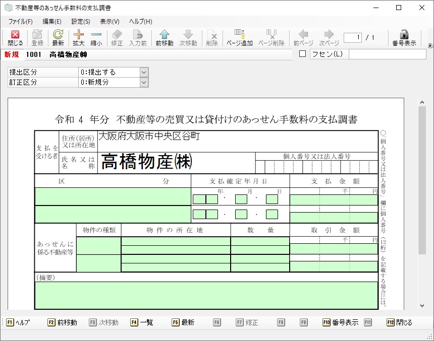 メニューの「支払調書1」-「不動産等のあっせん手数料の支払調書」を選択すると、以下のような画面が表示されます。