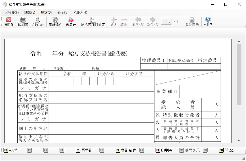 メニューの「支払調書1」-「給与支払報告書(総括表)」を選択すると、以下のような画面が表示されます。