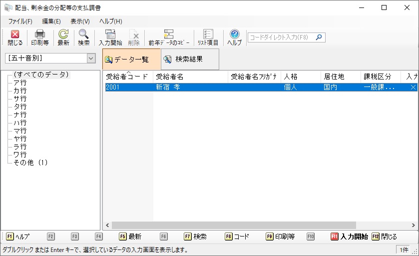受給者(配当等)ごとの『配当、剰余金の分配、金銭の分配及び基金利息の支払調書』を登録・出力します。