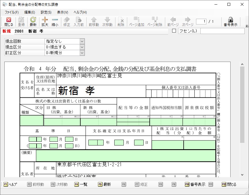 メニューの「支払調書2」-「配当、剰余金の分配等の支払調書」を選択すると、以下のような画面が表示されます。