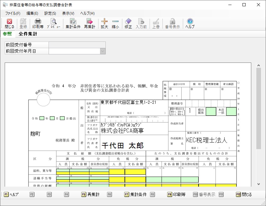 メニューの「支払調書2」-「非居住者等の給与等の支払調書合計表」を選択すると、以下のような画面が表示されます。