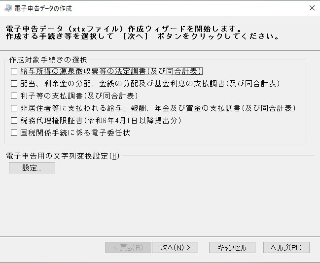 メニューの「電子申告」-「電子申告データの作成」を選択すると、以下のような画面が表示されます。
