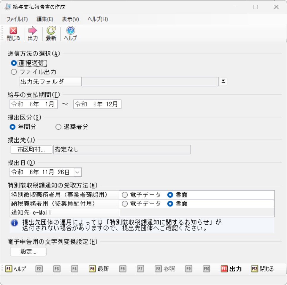 メニューの「電子申告」-「給与支払報告書の作成」を選択すると、以下のような画面が表示されます。