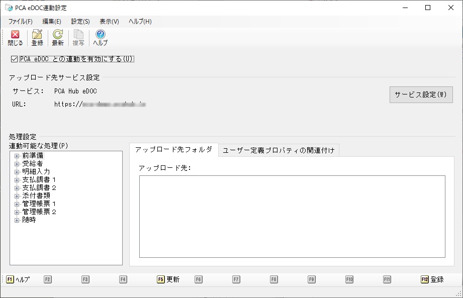 メニューの「随時」-「PCA eDOC連動設定」を選択すると、以下のような画面が表示されます。