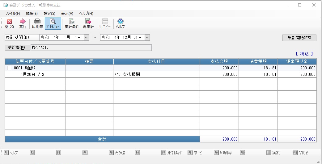 メニューの「随時」-「会計連動」-「会計データの受入」を選択すると、以下のような画面が表示されます。