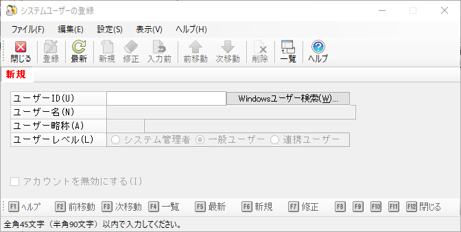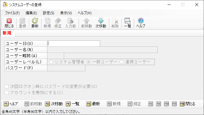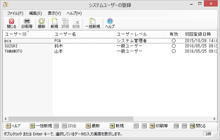 メニューの「セキュリティ」-「システムユーザーの登録」を選択すると、以下のような画面が表示されます。