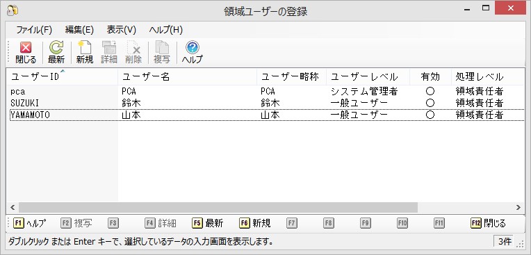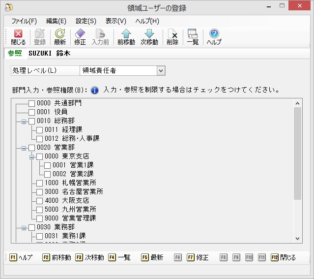 ※ 処理レベルが「領域責任者」ではない一般ユーザーがログオンした場合、本処理はメニューにも表示されません。