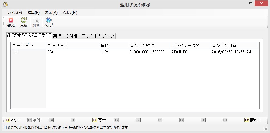 『PCA 法定調書シリーズ』にログオン中のユーザー、実行中の処理、ロック中のデータに関する運用状況を確認します。