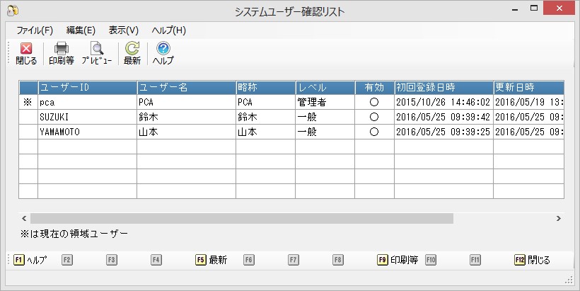 メニューの「セキュリティ」-「システムユーザー確認リスト」を選択すると、以下のような画面が表示されます。