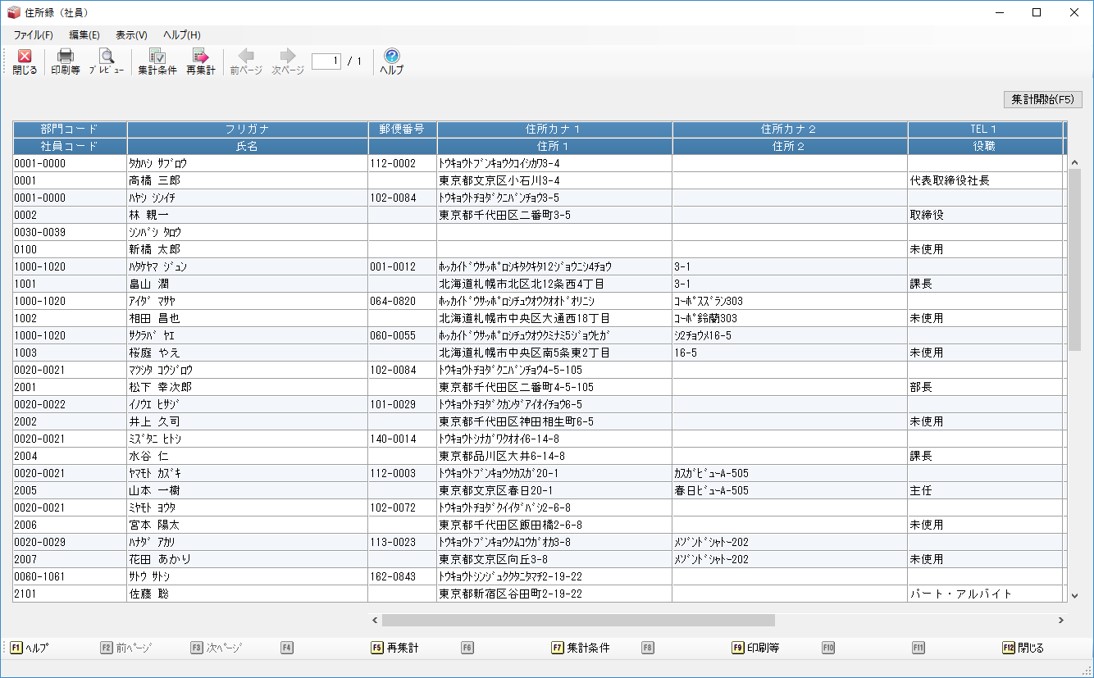 メニューの「管理帳票1」-「住所録(社員)」を選択すると、以下のような画面が表示されます。