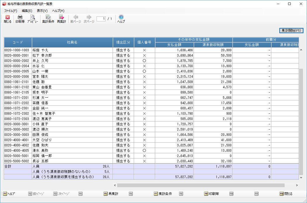 メニューの「管理帳票1」-「給与所得の源泉徴収票内訳一覧表」を選択すると、以下のような画面が表示されます。