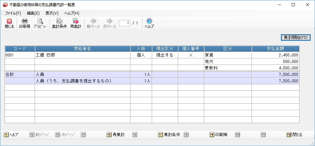 メニューの「管理帳票1」-「不動産の使用料等の支払調書内訳一覧表」を選択すると、以下のような画面が表示されます。