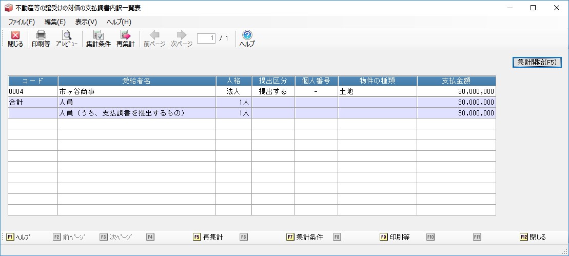 メニューの「管理帳票1」-「不動産等の譲受けの対価の支払調書内訳一覧表」を選択すると、以下のような画面が表示されます。