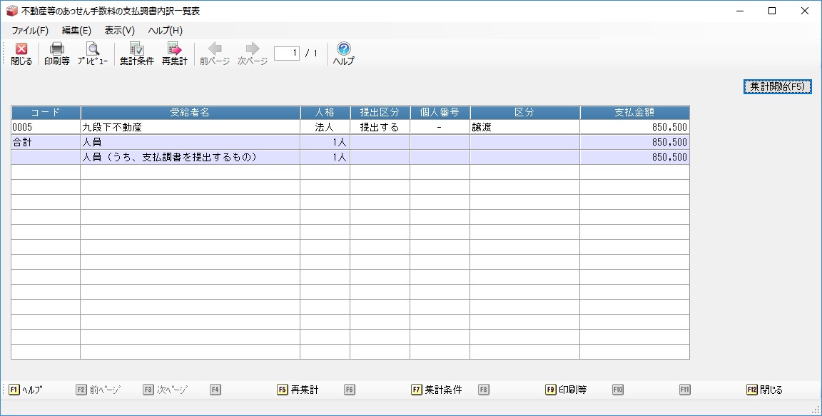 メニューの「管理帳票1」-「不動産等のあっせん手数料の支払調書内訳一覧表」を選択すると、以下のような画面が表示されます。