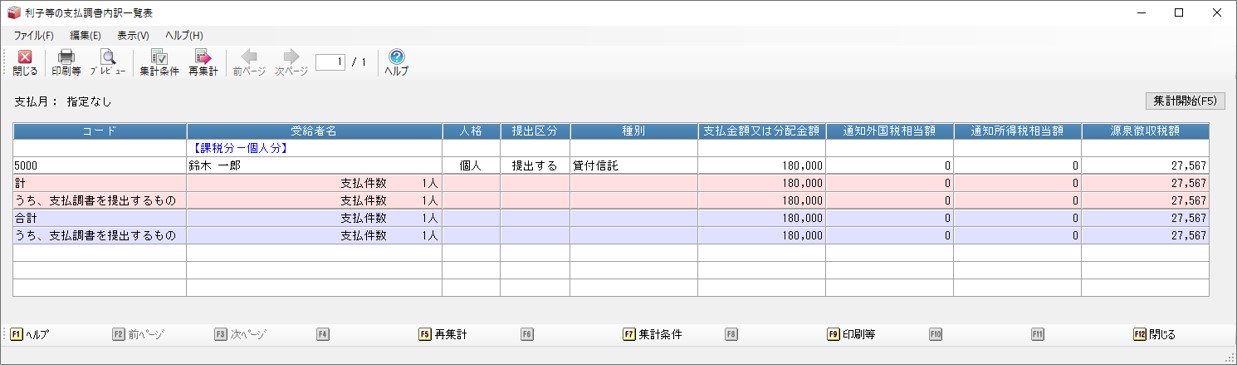 メニューの「管理帳票1」-「利子等の支払調書内訳一覧表」を選択すると、以下のような画面が表示されます。