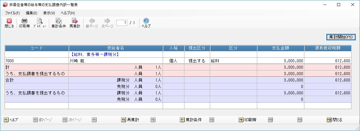メニューの「管理帳票1」-「非居住者等の給与等の支払調書内訳一覧表」を選択すると、以下のような画面が表示されます。
