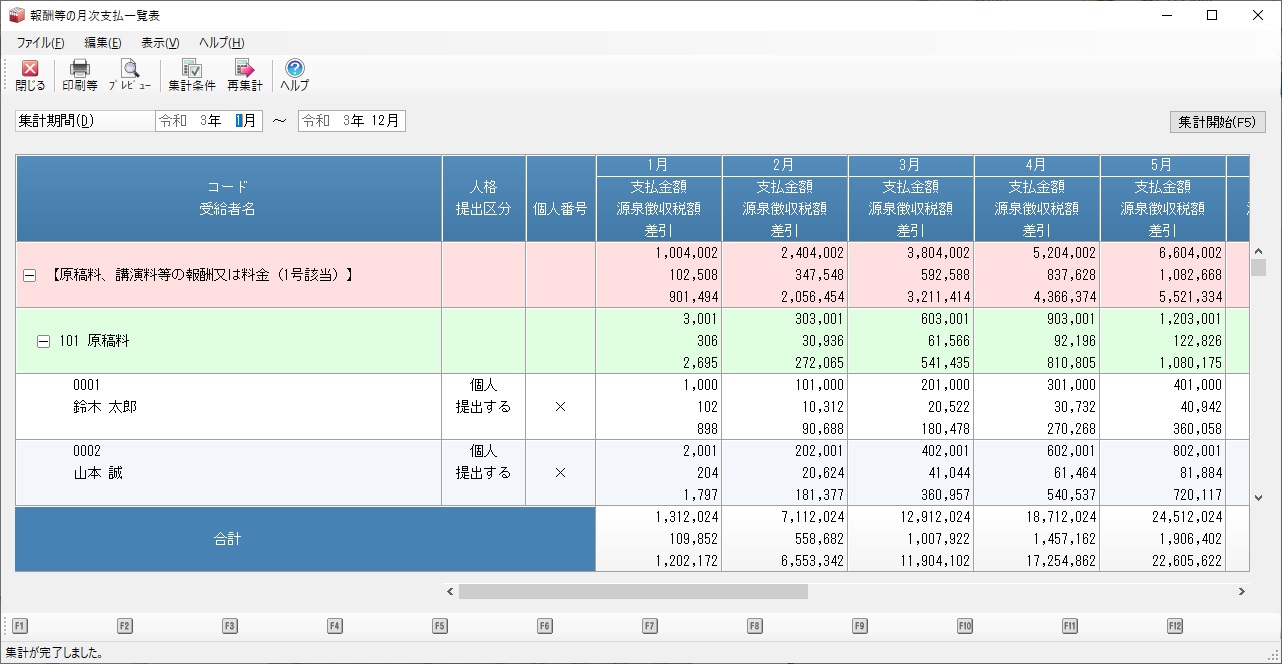 「報酬等の支払」のデータについて、支払区分ごとに月次の集計を行います。