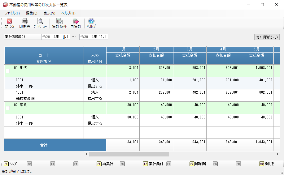 「不動産の使用料等の支払」のデータについて、支払区分ごとに月次の集計を行います。