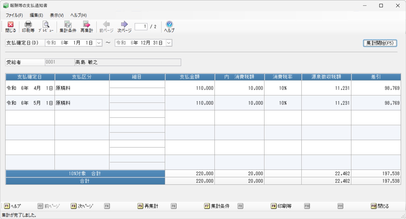 「報酬等の支払」のデータについて、受給者ごとに集計した通知書を出力します。