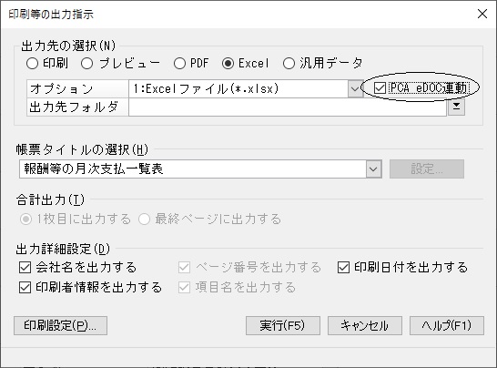 (1) 「印刷等の条件指示」画面等の「出力先の選択」で「PDF」または「Excel」を選択し、「PCA eDOC連動」にチェックマークを付けて出力を実行します。