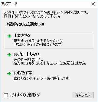(2) アップロード先フォルダに同名のドキュメントが既に存在する場合は、「アップロード」画面が表示されますので、動作を以下から選択してください。