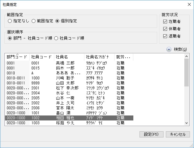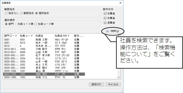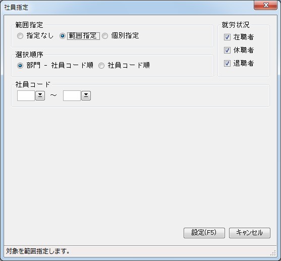[社員]ボタンをクリックすると、「社員指定」画面が表示されますので、「範囲指定」、「選択順序」、「就労状況」を選択します。