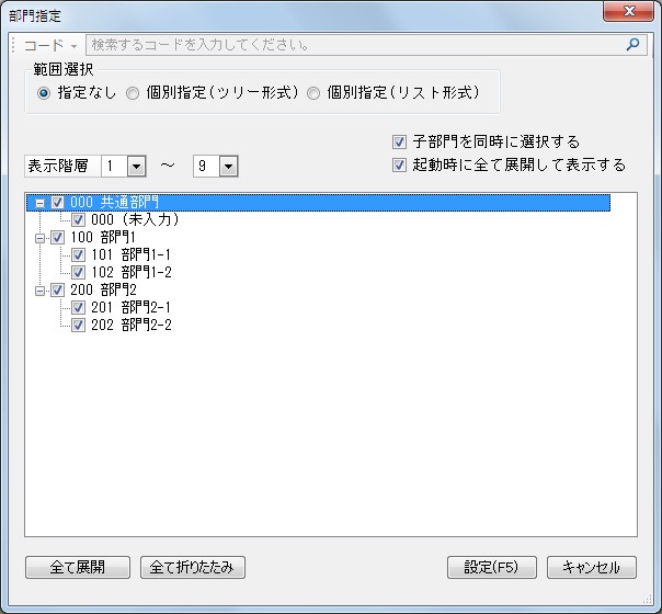 ボタンをクリックすると、「部門指定」画面が表示されますので、「範囲選択」「表示階層」などを選択します。