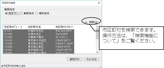 ボタンをクリックすると、「市区町村指定」画面が表示されますので、「範囲指定」、「個別指定」を選択します。