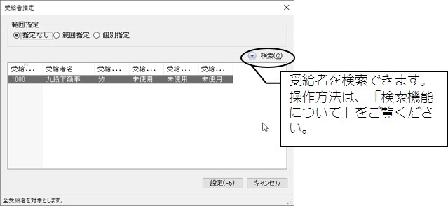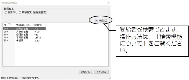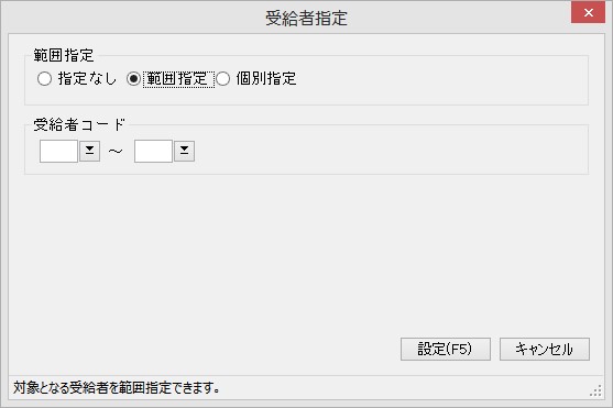 ボタンをクリックすると、「受給者指定」画面が表示されますので、「範囲指定」、「個別指定」を選択します。