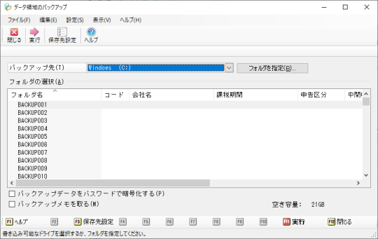 メニューの「ファイル」-「データ領域のバックアップ」を選択すると、以下のような画面が表示されます。