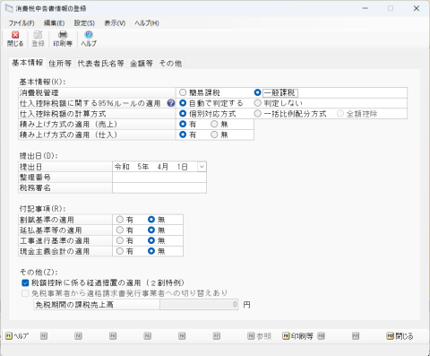 消費税申告書を作成する上で必要な情報(消費税管理方法、納税地など)について登録・修正します。