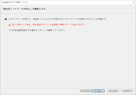 メニューの「データ連動」-「他会計ソフトデータの受入」を選択すると、以下のような画面が表示されます。