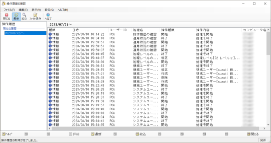 メニューの「セキュリティ」-「操作履歴の確認」を選択すると、以下のような画面が表示されます。