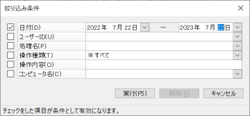 操作内容: 指定した文字でシステム履歴を絞り込みます。操作種類が対象となり、一部含まれる場合もその内容で絞り込みを行うことができます。文字は全角128(半角256)文字以内で指定します。