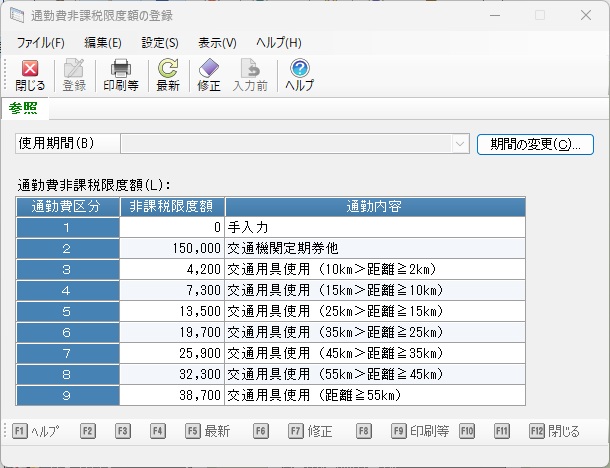 メニューの「前準備」-「通勤費非課税限度額の登録」を選択すると、以下のような画面が表示されます。