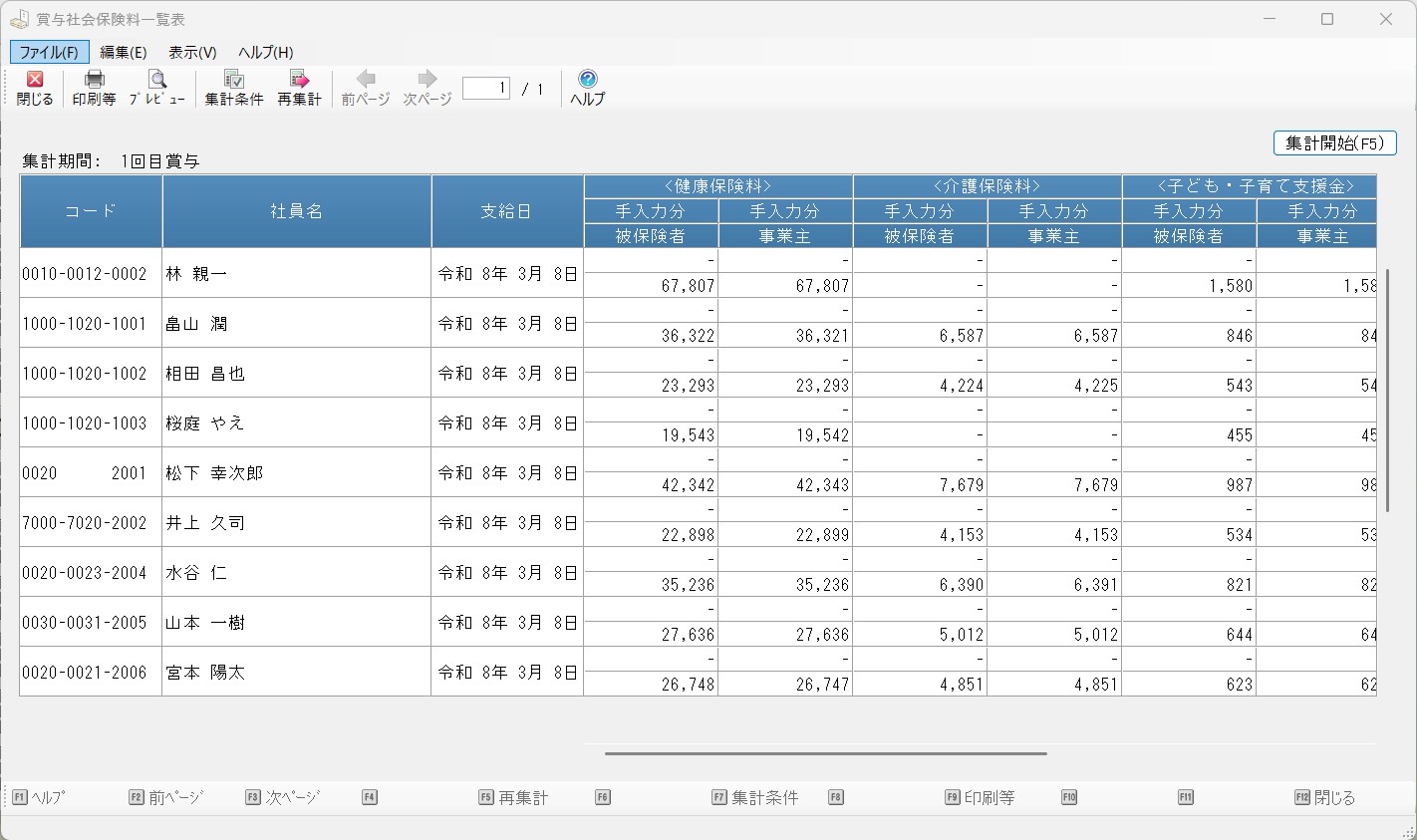 メニューの「賞与」-「賞与社会保険料一覧表」を選択すると、以下のような画面が表示されます。