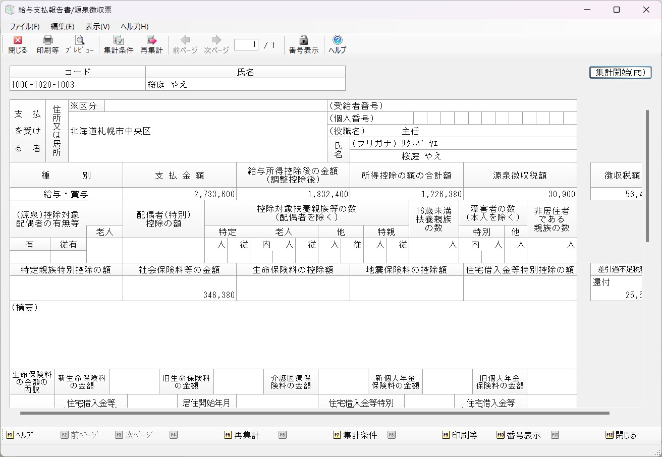 メニューの「年末調整」-「給与支払報告書/源泉徴収票」を選択すると、以下のような画面が表示されます。